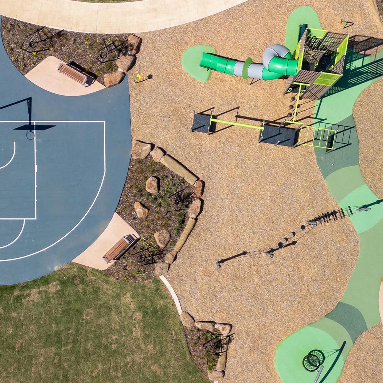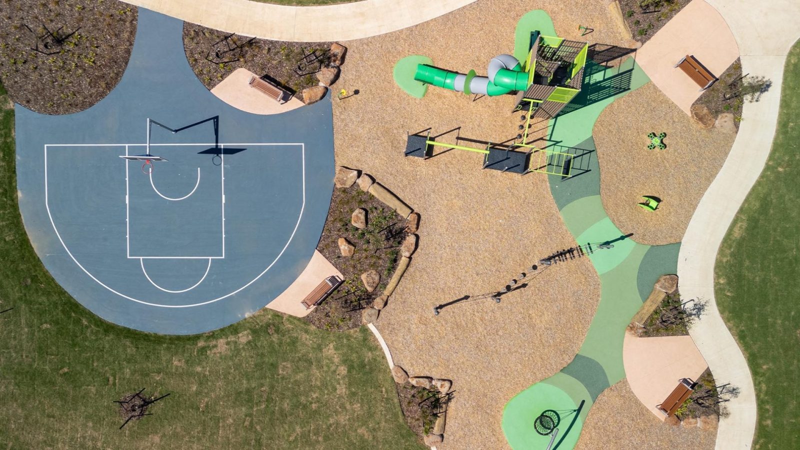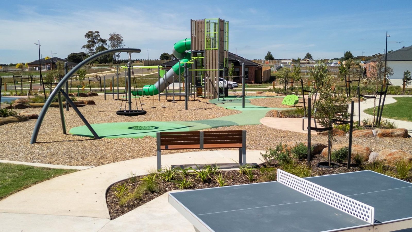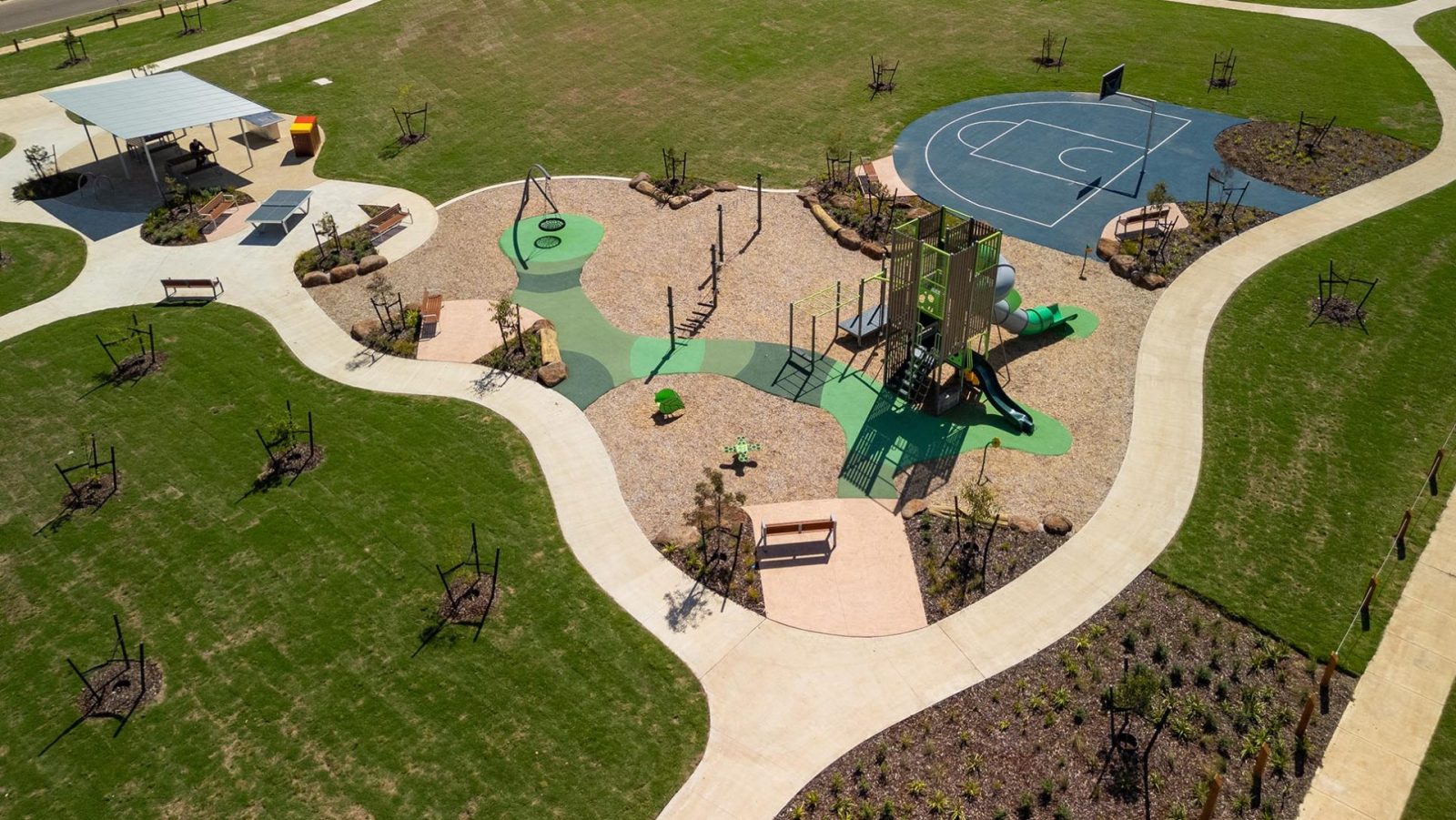- The Stage 9 Local Open Space contains a play structure, shelter, barbeques, ping pong table and basketball court spanning over approximately a hectare in this central location. UDL Group was able to sustainably retain original oak seedlings from the landowner for potting on and replanting to form a grove within the site.